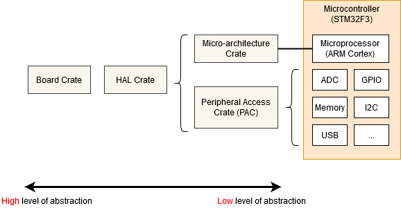 features and peripherals. It is usually implemented on top of a Peripheral Access Crate (PAC).